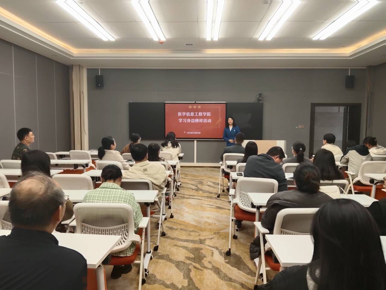 活动第二阶段:开展“学习身边榜样”专题活动,胡赟老师以“从学科竞赛到人才培养的实践路径”为题分享竞赛育人实践经验。胡赟老师结合自身指导学科竞赛的经验,分享了如何以竞赛为载体,锤炼员工实践能力、创新思维的具体做法,展现了基层教师立足岗位、深耕育人的责任担当,为支部党员提供了可借鉴的教学实践参考。