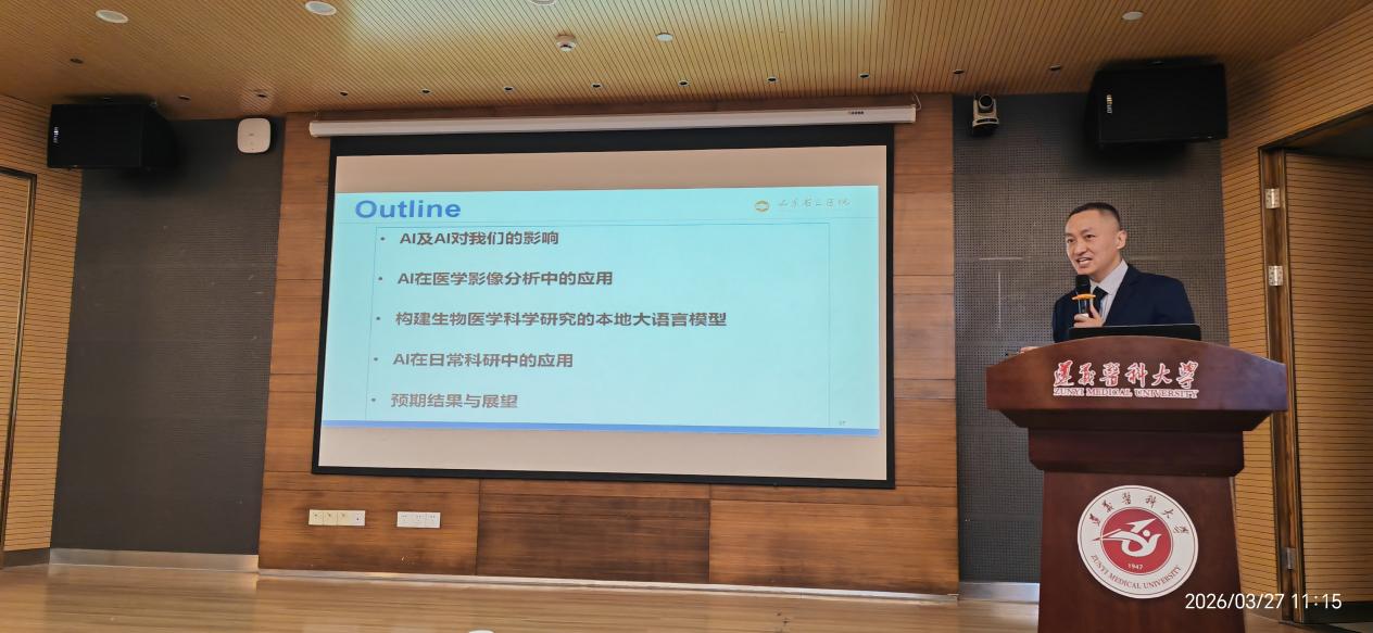 讲座中,徐峰教授围绕AI(人工智能)在个人工作中的体会,先后讲解了AI对人们学习和工作的影响、AI在医学影像分析中的应用、生物医学科学研究的本地大语言模型构建、AI在日常科研中的应用等内容,生动阐释了AI技术对现代医学研究与临床实践的深刻变革,让在场师生直观感受到人工智能的巨大潜力与应用价值。